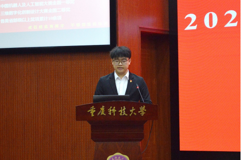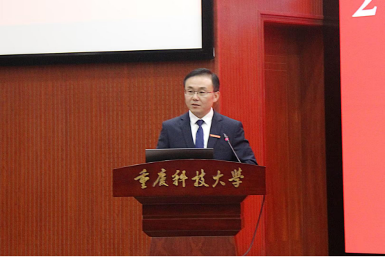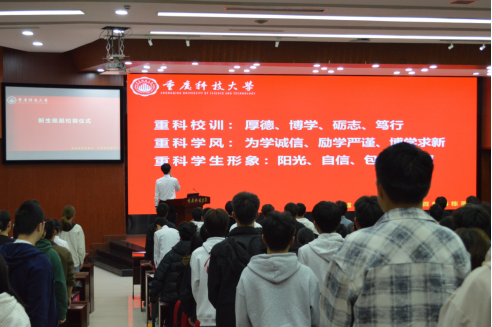 在庄严的新生代表佩戴校徽仪式后,全体同学共同学习了“厚德、博学、砺志、笃行”的校训精神与“为学诚信、励学严谨、博学求新”的学风要求,一致表示要争做阳光、自信、包容、进取的重科大学生。