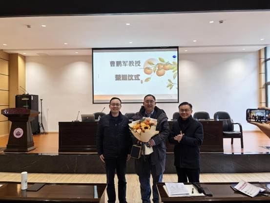 仪式现场,高逸锋和戴庆伟为曹鹏军教授献上象征感恩与祝福的鲜花和纪念牌,祝愿他退休生活惬意舒心、健康顺遂。